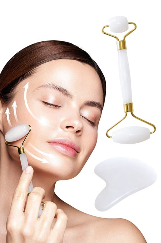 Otthoni ápolásra, intenzív mélyizomkezelésre kiváló, fehér jádekőből készült Guasha szett.