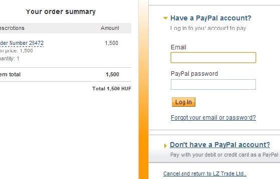 Ha a fizetésnél a paypal-t választod, át leszel irányítva a paypal oldalára, ahol ez a kép fogad: